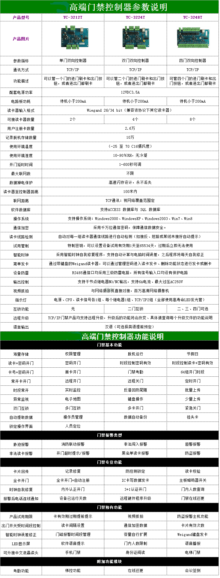 YC-32系列四门门禁控制器是智能网络型新一代门禁产品,采用超强网络处理器结合海量存储器研制,实现真正的网络化数据交换,数据高速运算与超大用户数据管理 YC-B32系列门禁控制器不但拥有常用门禁功能外,它还提供市面上其它同类产品没有或少有的一些实用功能,具体功能详见产品“系统功能”